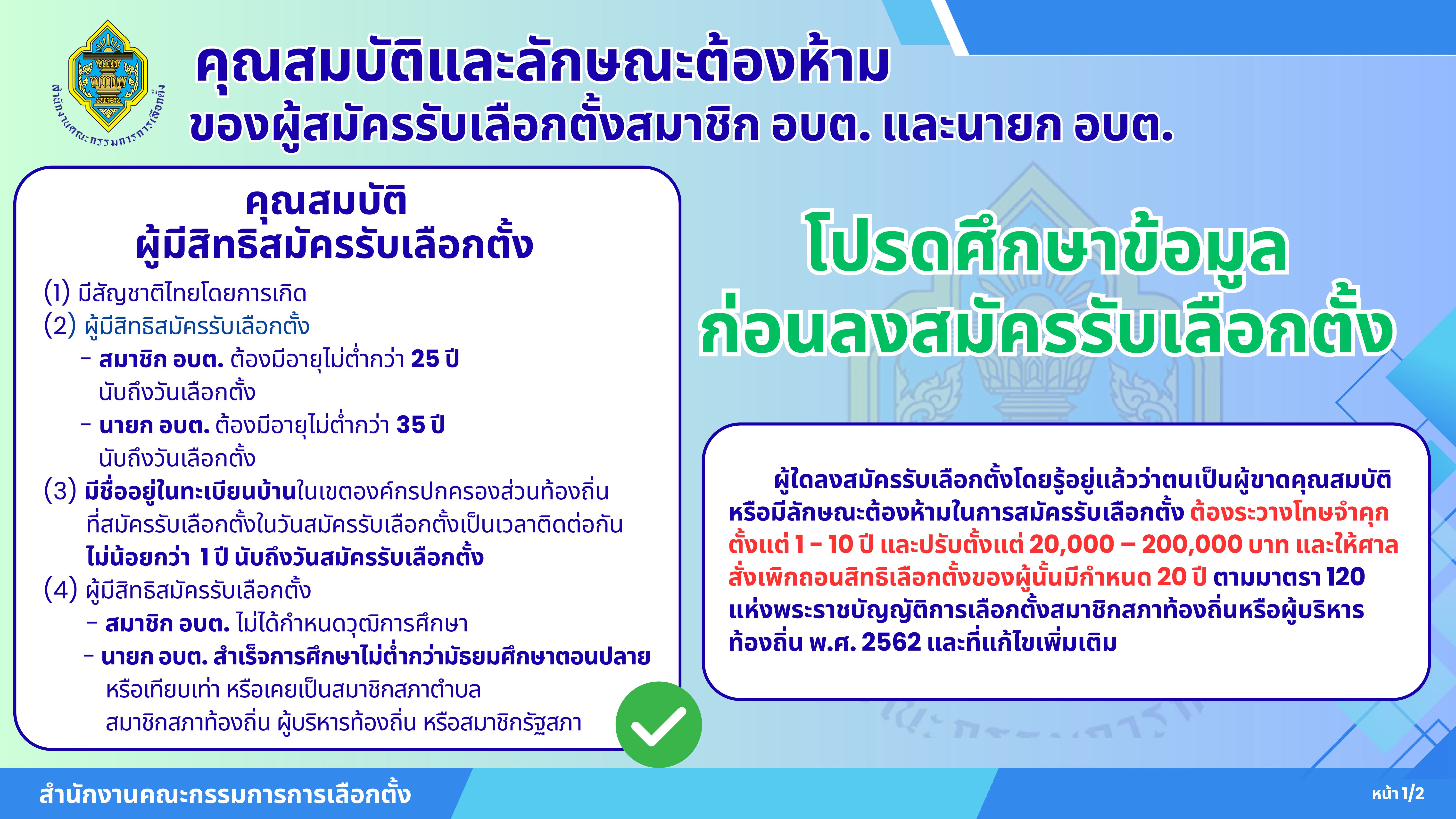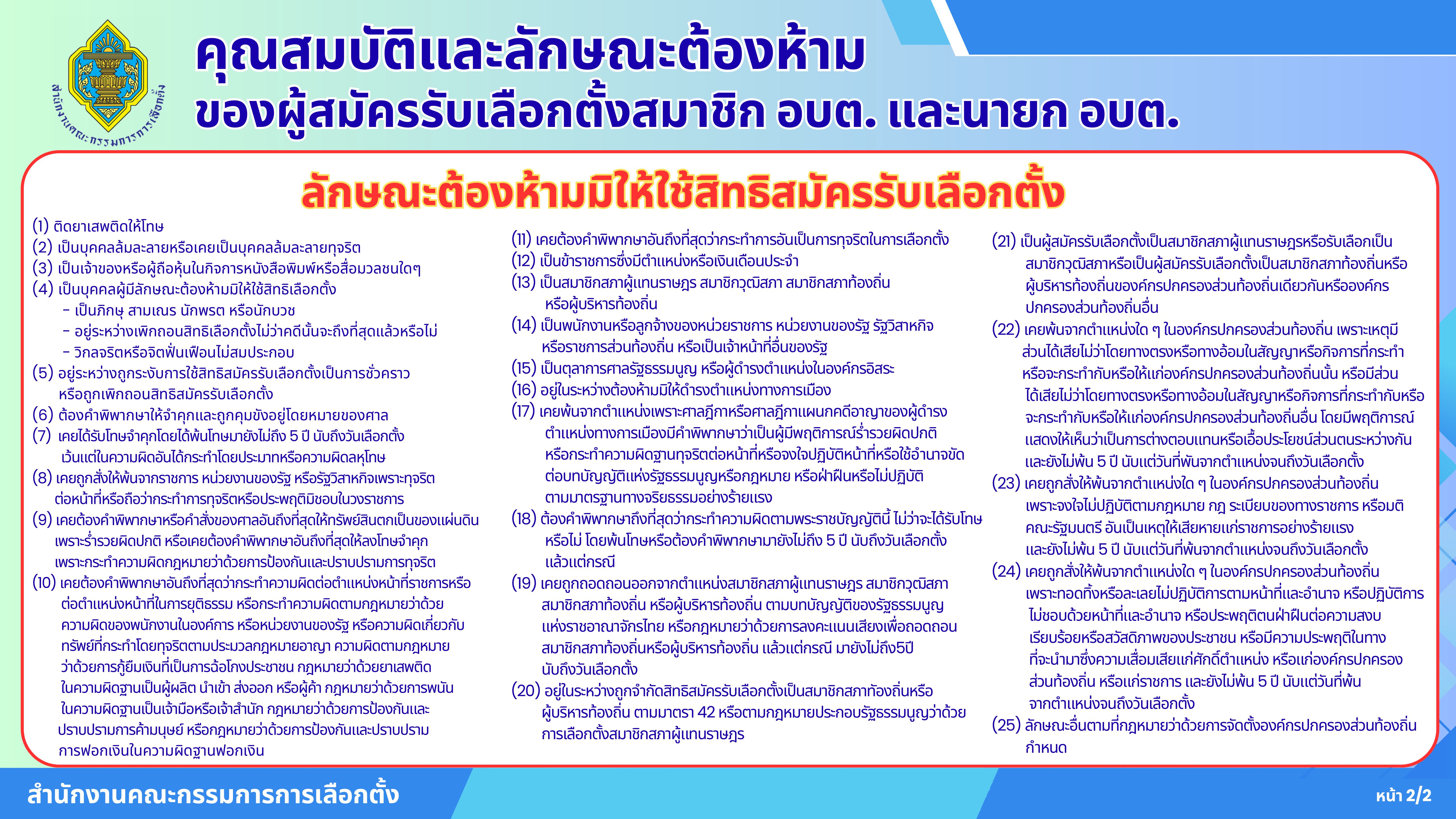 ประชาสัมพันธ์คุณสมบัติและลักษณะต้องห้ามของผู้สมัครรับเลือกตั้งสมาชิกสภาองค์การบริหารส่วนตำบล และนายก�...[วันที่ 2025-10-15][ผู้อ่าน 3]